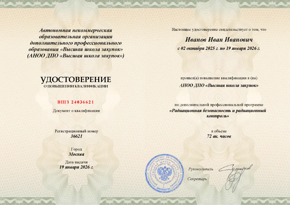Повышение квалификации, 72 академических часа, 9 модулей: законодательное и нормативное обеспечение, дозиметрия и приборная база, лицензирование, методики радиационной защиты при эксплуатации и обслуживании установок, действия при авариях и ЧС. Онлайн-обучение в в Красноярске с итоговой аттестацией.